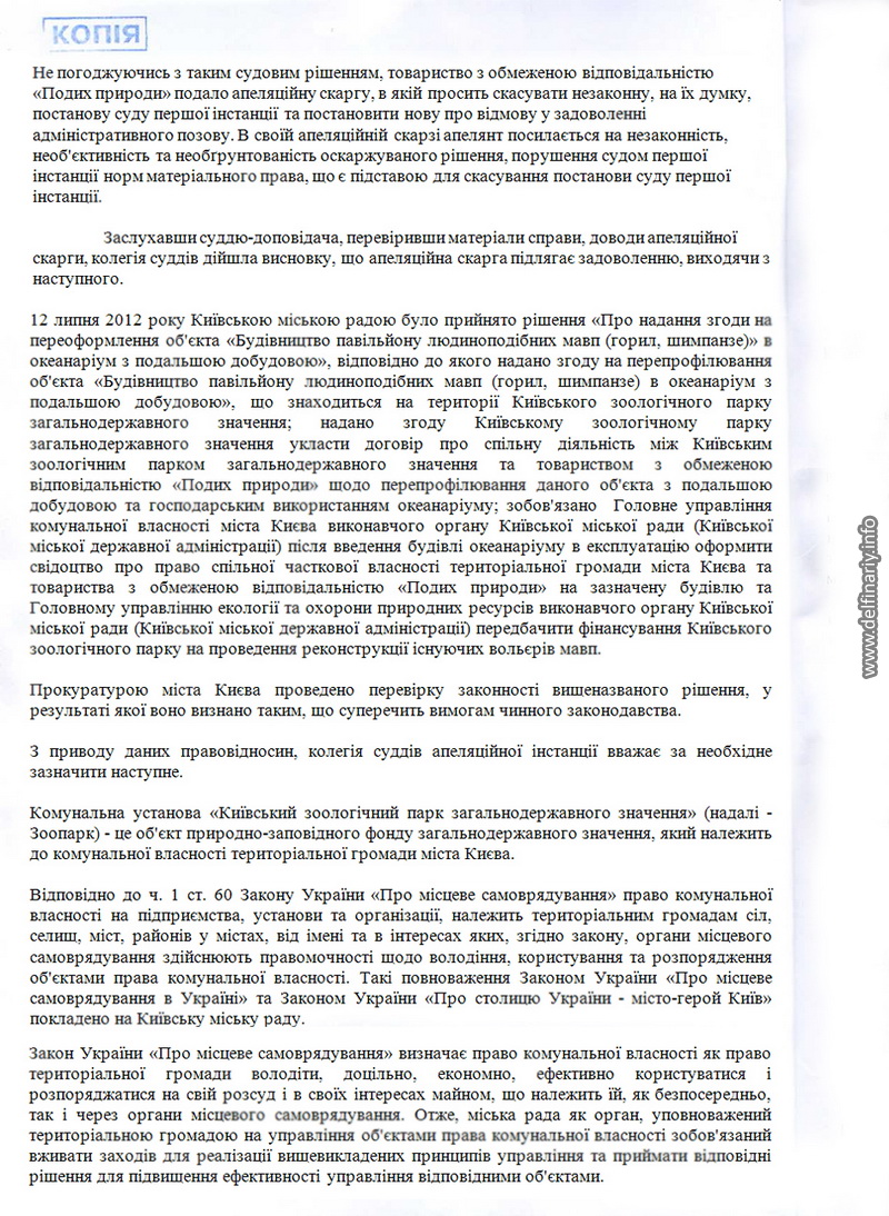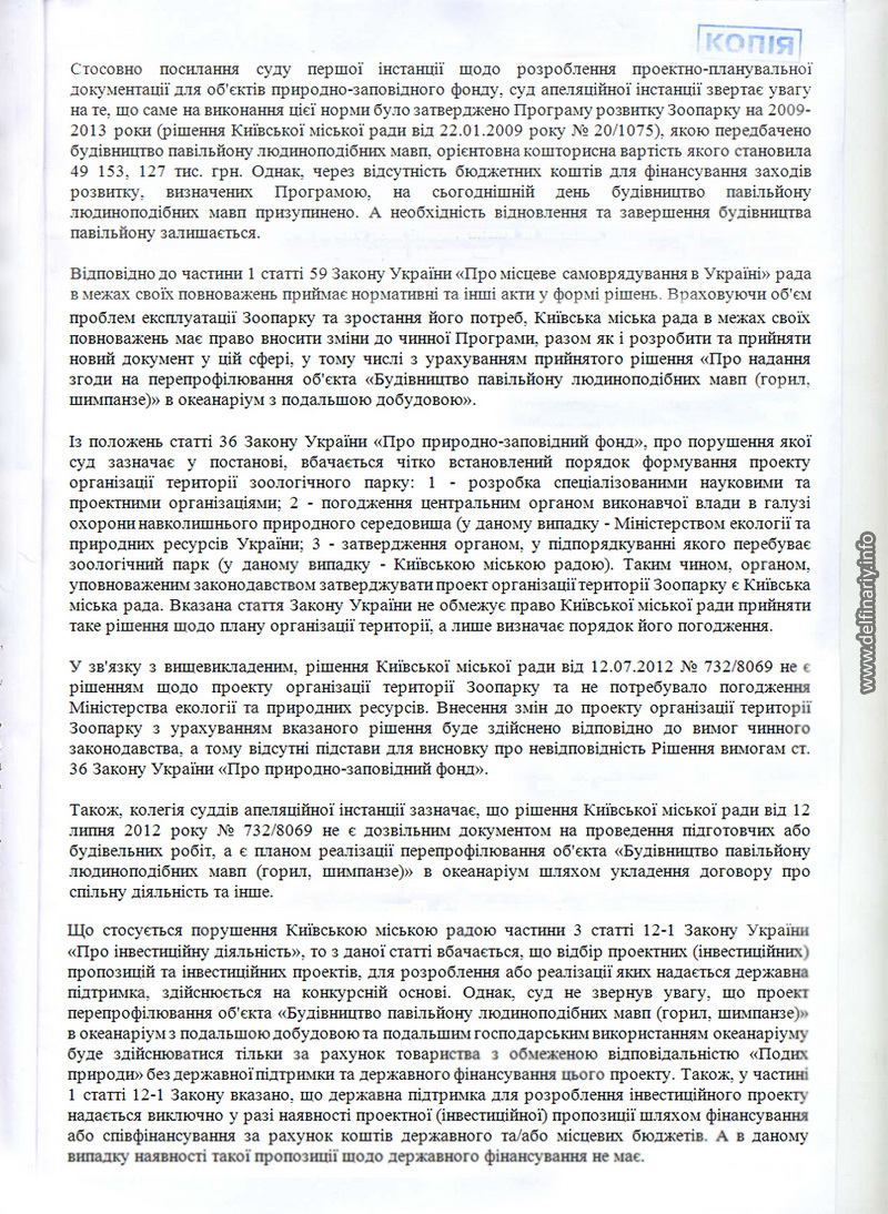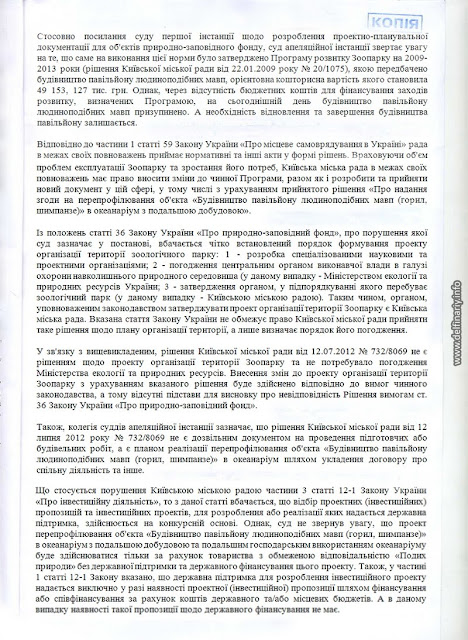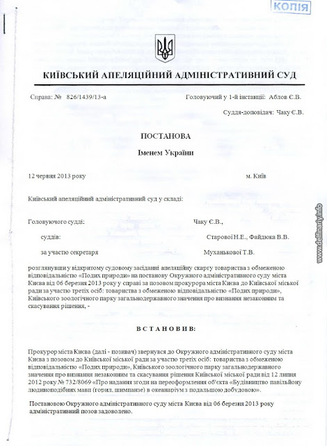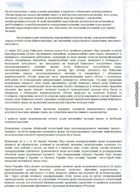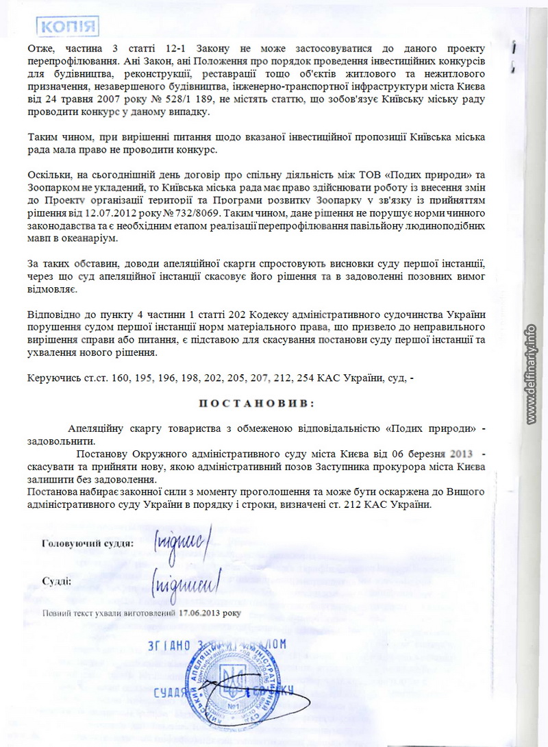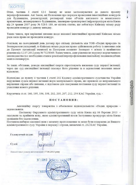 Причём в Постановлении суда вроде бы и говорится, что разрешения на строительство нет, но в то же время как бы намекается, что никакого строительства и не будет, а будет лишь перепрофилирование обезьянника в дельфинятник. И суд отмечает с одной стороны, что земли киевского зоопарка это природно-заповедный фонд в который соваться без согласования с Минприроды нельзя, но с другой стороны разъясняет, что согласовывать ничего и ни с кем не надо, поскольку речь не идёт о строительстве нового объекта, а всего лишь о перепрофилировании старого. Суд заметил, что поскольку на сегодняшний день (2.06.2013) договор о совместной деятельности между «Подихом» и Киевским зоопарком не заключён, то Киеврада имеет право проводить работы по внесению изменений в Проект организации территории и Программу развития зоопарка. Delfinariy.info понимает эту фразу так: как только будет заключён договор между Киевским зоопарком и ООО «Подих природи» Киеврада будет лишена права влиять на ситуацию в зоопарке.